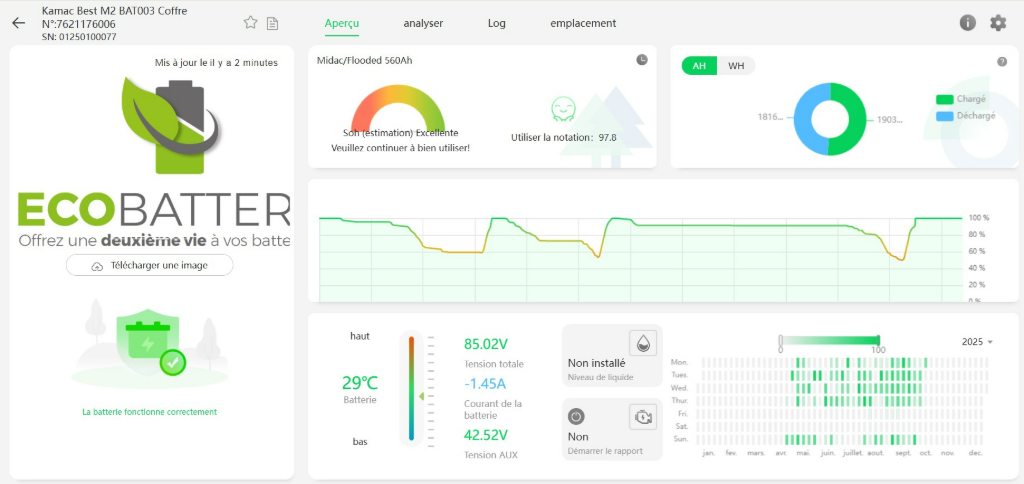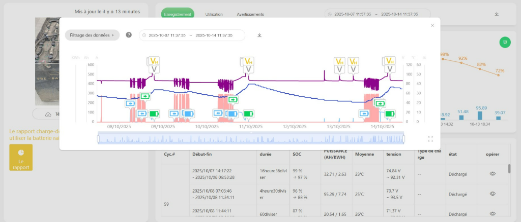 Grâce à un système de suivi en continu, vos batteries sont surveillées 24h/24. Le monitoring permet d’identifier les signes avant-coureurs de panne, de détecter les mauvaises habitudes d’utilisation (charges incomplètes, surcharges, surchauffes…), et d’anticiper les interventions nécessaires.